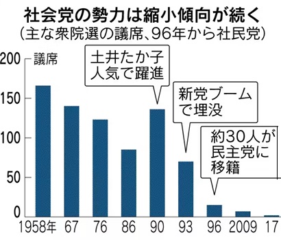 世界史的には、ユーロコミュニズムのように、大幅に右傾化して保守勢力とほぼ同じ状況になるか、日本共産党のように、鉄の一枚岩で団結する(異物を徹底的に排除)かしか、生き残りはできなかった。 日本では戦前の社会主義・共産主義は、主として前者を標ぼうする労農派(後の社会党)と後者の講座派(後の共産党)に分かれていたが、旧労農派は、ユーロコミュニズムほど右傾化はできず、中途半端に左派のままだった。かといって、共産党のような一枚岩化もしなかったため、常に内部の路線対立があり、”二本”社会党などと揶揄され続けていた。 1955年の保守合同の直前に、左右社会党が一本化したが、4年再度分裂し、1960年1月に、民社党が結成され、右派を追い出した形になった。 だがその後も、日本社会党は”二本”であり続けた。さすがに空気の変化読んで、’86年に新宣言を出して、マルクスレーニン主義との訣別を図ったが、これがかえって、党内の左右対立の激化を招いた。 その後、’94年に、村山委員長が首相になった折に、社会党は自衛隊容認、安保容認を打ち出し、結果的に社会党は、一気に右傾化した。村山氏が左派であったために、党内左派は、党の右傾化を容認せざるを得なかったのである。 こうした党の右傾化を追認する形で、’96年に社会党は社民党と改称したが、これに反発した党内左派は、同時期に新社会党を立ち上げた。また同年9月に(旧)民主党ができると、党内右派は民主党に逃げ、社会党は三分裂となったが、ある意味、社民党としては思想がまとまることとなった。ただし、党内が純化した分、党は確実に小さくなっていった。 だがこの社民党も、一枚岩ではなかった。やはり党内で右派、左派が生まれた。たとえば、北朝鮮拉致問題に対しては、福島瑞穂が「何が何でも対話重視、拉致問題は後回しでいい」と主張したのに対して、辻元清美や阿部知子は、「対話重視だが、拉致問題解決も大事」というスタンスだった。 結局、党内”右派”は民主党に移った。社民党はますます小さくなる。 党が事実上、国会議員が福島瑞穂一人になれは、左右対立はなくなると思いきや、今度は非議員を交えての争いになる。そのきっかけが、今回衆院選における沖縄第二区の争いである。 この選挙においては、明らかに、福島党首は党全体のことよりも、宿敵新垣邦男を落とす(新垣は、福島と仲が悪かった照屋の後継者だった)ことを優先させたとしか、思えない。つまり、福島はとち狂った。 それを正々堂々と正したのが、非議員である大椿だった。そして例の、党首選後の会見時のバトルとなった。 ここで明らかになったことは、社民党沖縄県連内が、福島瑞穂や山城博治という最左翼と、ある程度はまともな多数派の”二本”にやはり分かれていることである。 記事を読むと、「臨時大会を進行した議長は、瑞慶覧氏擁立を批判する案への支持が圧倒的に多かったと言及した」とある。しかしながら、選出された県連代表は反山城派の人間であり、実際には、さすがの沖縄県連でも、理性が勝ったわけである。 ただし、総括ができない異例の事態となり、社民党沖縄県連は、事実上の分裂状態に陥ったと見てよいだろう。 社民党はあと2年後には政党要件を失うだろうが、最後の最後まで、”二本”だった。左右を切り離して、一定のところに収斂して純化しつつ、そしてその代償で党勢は衰え、そして最後の最期に至ってなお、完全純化はできずに終わる。国会議員が足りず、最期は非議員を巻き込んで。 ●社民党はどうあるべきだったのか? 社会党(社民党)の歴史を見ると、だいたい10年ごとに節目があったことがわかる。 ①1986年・・・新宣言が出された 昭和の終わりころ。当時はまだ、社会主義の優位性を信じる人が多かったが、中国ではすでに鄧小平が、市場原理を取り入れた経済運営をしており、社会主義国ソ連は実は、(少なくとも経済は)やばいのではないか、と噂されていた。 それを察知してか、社会党はマルクスレーニン主義との訣別を図り、1986年に新宣言を出した。社会主義協会は猛烈に反対したが、少なくとも社会党全体がこれによって、かなり右を向いたことは確かであった。しかしながら、この宣言により、社会党の”二本”の路線対立が鮮明になったことも間違いない。 ただし、新宣言ではマルクスレーニン主義との訣別は図ることができたが、社会党のもうひとつの党是であった非武装中立はそのまま残された。 個人的な感想だが、ある程度ソ連の崩壊を予見している知恵者がいて、とにかくソ連とは訣別(=マルクスレーニン主義との訣別)せよ、しかし、非武装中立は社会党の柱だから残せ、という圧力が加わっていたのではないか、と思う。 新宣言は確かに、社会党の左を断ち切る効果があったが、非武装中立という”社会党らしさ”を残してしまった結果、民社党や公明党といったより現実的な政党との共闘を困難にしてしまった。 いずれにせよ、ソ