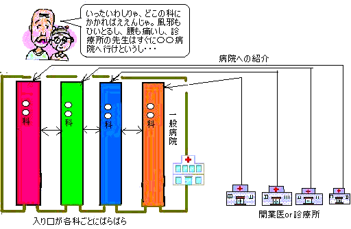 一般病院にしても窓口は各科に分断され、特にいろいろな病気をかかえる老人などはいったい何科にかかっていいか途方にくれてしまうだろう。長時間待ってやっと診察の順番が回ってきたと思ったら「ここは科が違うから○○科に行ってください」といわれ、また○○科の診察まで延々と待たされる。夜間や休日は当直医が診るが、大抵の病院は当直医は一人か二人で、各科全部そろっているわけではない。したがって救急患者が来ても「うちの当直医は専門がちがうから他の病院へ行ってください」となる。現在問題になっている小児救急にしてもそれを小児科医のみが担っているために夜間休日の半分近くを占める小児救急は手薄状態となってしまうのは当たり前である。