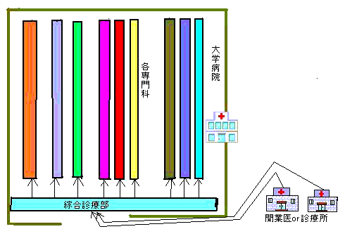 現在の医療体制の問題点 日本における現在の医療体制は図1の如くである。患者はまず近所の開業医や診療所を訪れる。あるいは病院の窓口を直接訪れる。 問題は一般病院であれ、開業医や診療所であり、その窓口が各科に分断されていることである。昔の開業医はなんでも診ていたし、夜間の往診などにも応じていたが、最近の開業医は自分の専門以外は診ないことが多いし、まして夜間は診ない(というか1人体制では診られないだろう) |