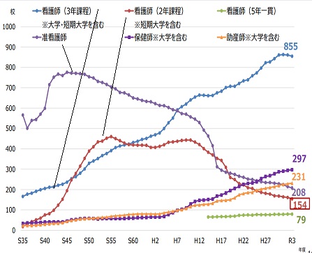 近年、この両者(准看養成、准看免許取得後2年の正看養成)は近年激減し、3年ないし4年の、直接正看を養成することが主流になっている。