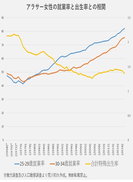 その次に、”「少子化は女性の社会進出のせい」は誤りである”というサブタイトルがついているが、これまた、サヨクがよく主張する命題である。