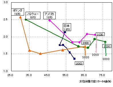 実際には、たとえば30歳前後の女性の就業率と出生率の関係の以下のグラフがわかりやすい。この著者の意見が完全に間違っているのがわかる。