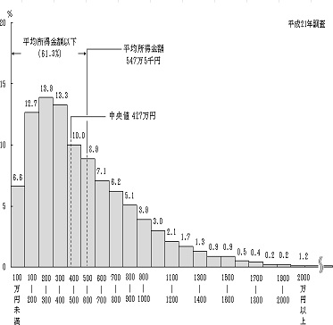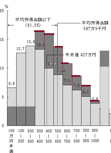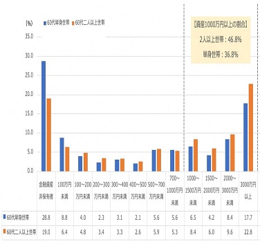 次に濃い灰色は50歳代の正規社員の所得分布である。当然のことながら、年齢が上がるにつれて、平均年収がぐっと増えることがわかる。それでもやはり、正規分布にはほど遠く、平均値>中央値、最頻値であることには変わりはない(50歳男子の平均値624万円、中央値550万円)。 ![]() 50代の平均年収【男女別推移・東京大阪名古屋など都道府県別推移】|平均年収.、2 所得の分布状況|厚生労働省より引用者作成 所得の場合、人間の能力、運等で、資本主義社会において、国家による再分配政策が行われた後でも、絶対に正規分布にはならない(学生時代の学力格差は概ね正規分布になることを考えると、興味深い)。 基本的に上記のようになり、通常、平均はあてにならず、それよりもかなり低めになる、中央値や最頻値が問題になるわけである。言うまでもなく、それは、極端に所得が高い人が少数いて、そうした人が平均所得を押し上げるため。 こうした曲線は、人間社会ではもっとも自然な形であると考えられ、たとえば共産主義社会はこれを、極端に狭い正規分布にしようとしたわけだから、社会が歪むのは当然と言える。 次のグラフは、ほぼ資産形成期を終了したと考えられる、60代の資産状況を示している。これはまさに、逆正規分布を示している。すなわち、両極端、金融資産非保有者と3千万円以上保有者が一番多い。 ![]() よく、高齢者の平均資産はいくらぐらいか、という問いがあるが、こうした実態をみると、そもそも平均の意味がないし、また、所得では非常に重要な要素となるメジアンやモードといった概念も無意味であることがわかる。 ●所得分布と資産分布グラフはなぜ異なるのか 普通に考えれば、所得分布と資産分布グラフはだいたい同じ曲線となるように思うだろう。仮に、すべての人の消費性向が同じだとすると、両曲線も同じになるはずである。 だが実際は、同じどころか、似てもいず、真逆。なぜだろう。 当然それは、長年のトータルでは、消費性向に相当な差異があるため、と考えられる。その差異は個人の性格、育ってきた環境が重要なポイントであり、所得額そのものはあまり関係がない、ということが重要である。つまり、所得が低くても消費性向が高い人はいるし、逆に、高所得者でも消費性向が低い人がいる。当たり前だが、前者は金融資産がないか少なく、後者は多い。そしてそのために、必ずしも所得が低い人が金融資産が少ないとは限らないし、逆もしかり、である。 要するに、消費性向の差異が、結果的に上記のグラフを生むことになる。欲望を抑え、将来のためにコツコツと貯金をし、投資などで増やした人は、仮に所得がさほど高くなくても、かなりの人が、3000万円以上の資産が築けたことだろう。 よく、政治が悪いから資産が築けない、と言って文句を言う人がいるが、それは間違いであることがわかる。つまり、資産が築けるかどうかは、国家ではなく、個人の自己責任なのだ。 上記グラフによれば、60代の夫婦がそろった世帯のおよそ半数が、1000万円以上の金融資産を有していることがわかる。むろんこれだけでは老後の生活には十分とは言えないが、ここまでの資産を築けた人は、年金もそれなりにはあるだろう。少なくとも、生活のためだけに働かざる状況ではなさそうである。 60代夫婦の約半数は、それなりの資産+年金があり、多少の労働で暮らしている。こうした人たちは、やはり若いころから、欲望を抑え、コツコツと資産形成に励んできた、要は勝ち組である。それは、自助努力の賜物に他ならない。 逆に、単身者だと、3割が無資産、半数が500万円以下の資産しかない。こうした人たちがしかし、若いころからの所得が極端に低かったとは考えられず、消費性向が高かったがゆえに、要は、老後のことなど考えずに、若いころから欲望のままに、費消を続けた結果である。 上記のグラフで興味深いのは、保有金融資産200万円以上レベルになると、単身者と所帯持ちの差異がなくなるか、逆転すること。夫婦そろって経済観念のない人も一定数、いるのだ。 消費性向は、たとえば日にち単位だとさして個人差はないように見える。しかし、一日100円でも、意識して貯金する人は、一か月で3000円、一年で約4万円弱、30年で100万円以上の差異となる。これを福利で運用したら、何百万円の差となる。 わずかな消費性向の差でも、何十年の積み重ねではものすごい差異となり、その結果が上記のグラフ。 将来年を取れば、思うように働けなくなることなど、人間であれば、誰でも想定はできる。そこまでは万人が同じなのだが、そのために、老後のために、日ごろから若いころから貯蓄ができるかできないか、ちょっとした努力の差異が、上記のグラフを作るのだ。 | |||