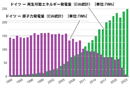![]() ドイツでは、2011年の日本における原発事故を契機として、メルケル首相(当時)の主導のもとで、脱原発政策が取られ始めた。さらには、再エネ促進もそれ以前からなされており、ちょうど2011年頃で原発と再エネ発電量は逆転している。その後ドイツは、脱原発を粛々と進め、2023年を最後に、原発出力はゼロとなっている。対照的に再エネは2011年以後も順調に伸びてはいるが、ここ数年はほぼ頭打ちのようである(上図)。 メルケル氏は、脱原発をドイツに導入するに当たり、①電力消費量の10%削減、②火力発電能力の1000万~2000万kWの増大、を要求していた。 ①については誰しも直観的にわかるだろうが、②はなぜなのか?脱原発をし、再エネを拡大するなら火力発電も減らすべきではないのか? 実は、2011年以降、ドイツの火力発電量は確かに減少している。だが、発電能力は増えているのだ。その理由は、再エネが不安定電源であるため、火力発電によるバックアップに欠かせないためである(つまり火力発電所の稼働率は落ちる)。 ただ発電能力は、実際にはメルケルの基準には到底達していない(下図)。 ![]() No.359 ドイツにおける電力部門の脱炭素化政策 - 京都大学大学院 経済学研究科 再生可能エネルギー経済学講座より引用者作成 ちなみに、①についても、10%削減目標には到達していない(下図)。 ![]() つまりドイツは、メルケルの基準に達しないままに、脱原発を完成させてしまったのである。では、それはどのような影響を及ぼしているか? 如実に現れたのが、電力の輸入・輸出バランスの変化である。ドイツはこれまでずっと、再エネの増大もあって、電気余り、の状況であり、したがって、輸出超過状況が長く続いた。だが、ここ1,2年は、上記のように、節電が思うように進んでいなかったのと、バックアップの火力発電能力が不足していたために電力の需給バランスがタイトになり、輸入超過になってきている。だいぶ前に脱原発をしたイタリアと同じ状況である(イタリアはずっと輸入超過が続いている)。 ![]() ![]() 要するに、今後のドイツの電力事情はイタリア化することであろう。(定量的にはともかく、少なくとも定性的には)。つまり常に電力は不足している状況。 さらに都合が悪いことに、ドイツで作られた電力の多くは、再エネによる質の悪い再エネ発電である。この点、まだイタリアの方がましと言える(イタリアのVRE発電率29%、ドイツ46%。イタリアは火力発電国なのだ)。 つまり、メルケルの基準が守られないままに脱原発化したことで、電力不足に加えて、発電の不安定化が加速され、ドイツはさらに安い値段で電力のダンピングをせざるを得なくなり、電気料金は今後ますます高騰し、ドイツ経済を圧迫していくことだろう。 ドイツはイタリア同様、なまじ、フランスという原発大国が近隣にあるがゆえに、それを頼っての脱原発を行った。だがこのことは、化石燃料を輸出しながらEV化を進めて環境問題を改善していると言い張るノルウェーと同じ矛盾したやり方であり、自分の玄関だけを掃き清めてごみを減らしたというようなものである。 つまり、自国のみで脱原発を行ったところで、自己満足以外の何物でもない。どうせやるなら、欧州全体を脱原発化すべきだろうが、そうしたら、欧州経済が立ち行かなくなる(奇妙なことに、ドイツはそれをわかっていながら脱原発を行なったのだ)。 その点日本は、なまじ電力の輸出入ができないがゆえに、原発を残すことができた。よかった。 P.S. ところで、日本国内の,ドイツの脱原発政策を支持する人たちは、これまで,ドイツの電力輸出超過を理由に,ドイツは正しい、と主張してきた。今後、ドイツがイタリア化した場合、彼らはどのように弁明するのだろうか? | |||