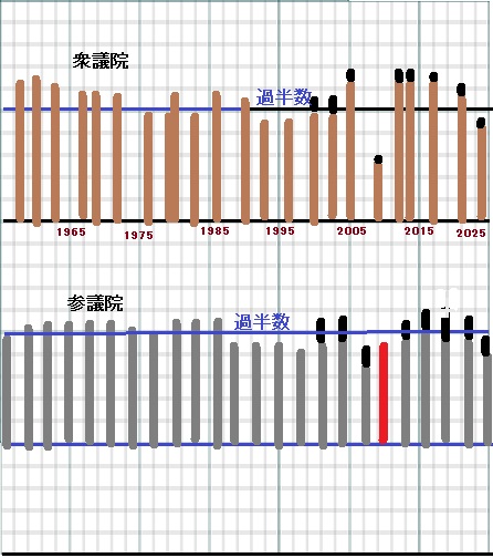 ●公明党効果は参議院にあった 下図を見るとわかるように、公明党効果は、参院選で著名に現れている。自民党単独で参議院議席が単独で過半数となったのは1986年の中曽根政権の時が最後で、それ以後はすべて過半数割れとなっている。安倍政権、小泉政権でさえ、そうなのである。 ![]() 衆議院議員総選挙 参議院議員通常選挙 もともと、55年体制以後昭和の間、、自民党の参議院議席は、衆議院と比べて、きわめて安定していた。衆議院の場合も、昭和40年代までは、革新勢力が一定の力を持っていたとはいえ、野党主力は、所詮はマルクス=レーニン主義を信奉する社会党であったがゆえに、どう頑張っても自民党の半分~2/3が精一杯であり、自民党の過半数維持を脅かすことはなかった。だが昭和50年代に入ると、中道勢力が大きくなって多党化の時代となり、自民党の過半数を脅かすこともたびたびあったが、無所属者の一本釣りなどで何とか対処していた。 両院とも変化があったのは、平成に入ってからである。’89年参院選で、自民党は初めて過半数を割った。この時には宇野内閣であったが、総理の女性スキャンダル、リクルート事件、消費税導入が自民党への逆風となった。 衆議院はやや遅れて、小沢一郎が自民党を割って野党となった’93年の宮沢内閣時に、自民党は、それまでのような、小手先ではどうにもならないような過半数割れを引き起こした。 要は平成に入ってから、自民党だけでは政権維持が困難となり、1999年からの自公連立(当初は自自公)内閣発足となった。そしてその効果は、前述のように、参議院で著名に現れたのである。 もともと、衆議院のカーボンコピー、あってもなくても同じと言われていた参議院だが、平成になり、自民単独過半数維持が不可能になると、政局の台風の目となった。1989年でぼろ負けした宇野政権は短命で倒れ、次の1992年参院選は翌年の自民党下野のきっかけとなり、1998年敗北では橋本内閣が退陣、2007年の敗北は第一次安倍内閣退陣、そして今年の敗北で石破内閣退陣、となった。 少なくとも参議院を見る限り、公明党が離れた今のままでは、自民党は単独では、絶対に過半数を超えることはないだろう。したがって、今後はおそらくは半永久的に、ドイツのように、連立政権が続くことになるだろう。 ドイツの例を見るまでもなく、その場合大事なことは、どの党と連立するのか、ということ。その前に、そもそも自民党政権が続くのか、という問題がある。公明党が連立離脱をした今、1993年の再来は、あり得るのだ。 ●今後のシミュレーション では今後はどうなるか。そもそも、首相が高市自民党総裁になるのか玉木国民民主党代表になるのか、というレベルからの問題となる。 ①オーソドックスなケース 一回目の首班指名選挙は基本的には皆、各党の党首に投票するだろう。当然、誰も過半数に届かないから、決選投票となる。 決選投票で、立民は野田代表ではなく、玉木氏に投票をすると言っている。衆議院では、参議院と違って立民は1/3ほどの勢力があるが、それでも両党だけでは175票であり、自民の196票には及ばない。公明党が玉木氏に投票すれば199票となって、自民票191を上回るが、同党は自民と縁切りをしたわけではないので、さすがにそこまで節操のないことはせず、白紙か無効票で望むだろう。 ただこの提案は、玉木氏自身も話しているように、はっきりいって、有難迷惑である。なぜなら彼は、仮に政権を取るにしても、立民と組む気はサラサラないから。両党はもとをたどれば民主党だが、ヒトとサル並みに違う進化を遂げてきた。もはやヒトとサルがHできないように、両党は同居することはできない。 こういう空気が読めないのが立民、就中、安住なのだ。無論、維新が乗れば、3 党で210票となり、玉木首相が誕生するが、まずそんなことはなかろう。維新だって、玉木首相はともかく、将来、立民と連立を組むのは避けたいのだ。それならまだ、高市自民と連立を組むか、単独野党のままでいた方がよかろう。したがって維新もまた、決選投票はおそらく、白票か無効票で望むだろう。 こう考えると決選投票は、高市196票、玉木175票で、オーソドックスに高市総裁が首相となる。ただ、白票・無効票が異様に多くなるので、首相の地位を貶めることになりかねない。それは、首相権限の弱かった戦前に通じることになる。 ②オール野党(参政、日本保守を除く)が玉木代表に投票 小沢一郎のような人物がいて、決選投票で、立民、公明、維新、国民民主までを串刺しにすれば234票となり、野党連立政権が誕生する。さすがにれいわ、社民、共産は除外するだろうが、立民はかつてはこれら3党と四党共闘を組み、政策協定まで結んだ過去があるので、こうした政党がブーブー言い出すかもしれない。 ただ、①でも述べたが、四党のうち、立民は明らかに異質であり、公明もそれに近いので、この四党が玉木代表を支持すれば、世間は明らかに野