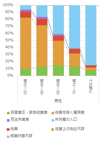 我が家の右隣は和菓子屋さん、左隣はお寺さんで、ともに自営業。この人たちを見ていると、そもそも確かに、ワーク≒ライフになっている、とつくづく感じる(ワークライフバランスが取れているというより、両者が一体化している)。 和菓子屋の親父さんはもう90歳近いはずだが、いまだにバイクに乗って、元気そのもの。和菓子製作は息子さんにもう譲っていると思うが、なんだかんだ、いろいろなことをしている。奥様も同様。 左隣のお寺さんは、お寺は大きいが、お墓はそれほど多くはなく、お寺だけで食べていくのは難しそうに思うが、子供がいないせいか、何とかやっているんだろう。坊さんは60歳代後半で私と同じくらい。 両者を見ていると、とにかく通勤が不要な人生はよさそうだな、ということ。むろん、朝起きたら着替えて、朝食を摂って、という生活は私たち勤労者と変わらないが、とにかく家にずっといられる生活はうらやましいとよく思う。 私の場合、幸い、職場が近く、クルマで15分程度の通勤時間で済んでいるが、それでも彼らをうらやましいと思う。 これが都会のサラリーマンなどの場合、1時間以上の電車通勤はザラで、若いうちはともかく、定年後でそうした生活は大変だと感じる。61歳の時に、一か月ほど1時間弱の電車通勤をしたことがあったが、その時点で、こんな生活が、年を取ってからずっと続くのは耐えられない、と思った。 つまり、自営業の人は、日常生活の中で、仕事がすっかりはまり込んでおり、お金を稼ぐというよりも、年をとってもこれまでの生活の延長が続く形で働いている、という印象が強い。彼らにとって、好むと好まざるとに関わらず、働くことは生活に通じており、まさにワーク≒ライフ、なのだ。 会社役員も似たようなものだろう。企業の経営に大きな責任を負っている人はだいたいが、若い頃には、モーレツに働いている。彼らは、多くは、好き好んで働いているわけで、彼らにとってもやはりワーク≒ライフだと言える。 こうした人たちは、年をとってもいつまでも働き続ける。下図でわかるように、高齢になると、雇用者ワーカーはさすがに激減していくが、会社役員はさほど減らず、自営業者はむしろ70歳代前半までは増え続ける(雇用者から自営にとなる人、たとえば開業医などがおそらく、このシフトを構成している)。そして75歳以上で働いている人は、大半が自営業か役員となる。それは彼らの生活が、ワーク≒ライフである証左と言える。 ![]() 【シニアの概況】高齢者の就業状況 2020年6月 | シニアライフ総研より改変 ●ワーク≒ライフか、ワーク≠ライフか 働くことにはさまざまな理由・目的があるのだろうが、ワーク≒ライフの人は、、ワーク≠ライフの人よりも、幸せな人生だろうと思う。つまり、生活の中に仕事が組み込まれているような人と、仕事と生活を分けて考える人では、前者の方が幸せなのではないか、ということ。 65歳を過ぎると、特にこうした傾向が身に染みてくる。 壮年期までは、特に結婚して家族を養っていれば、必ず働いて所得を得なければならない。この時期もむろん、ワーク≒ライフであることが望ましいが、人生のこの時期は、なかなかそれは難しい。幸か不幸か、日本においては、壮年層は生産性以上の所得があるケースが多いので、ライフのことはさておいて、馬車馬のように働かざるを得ない人が多いことだろう。 だが、役職定年、定年を過ぎ、ことに年金受給年齢ともなると、老齢年金というベイシックインカムを得られることもあり、ある程度余裕をもって働くことが可能になる。つまり、ワーク≒ライフが実現しやすい。 だがこういう人たちとは別に、年寄りの中には、年金収入などが少なく、ライフのことは無視して、ワークせざるを得ない人たちもかなりいる。つまり、ワーク≠ライフ。こういう人たちは、老後の生活費用に追われて、ライフを楽しむ余裕などないだろう。 本来、日本の社会保障制度にきちんと乗って生きてきていれば、65歳になれば、十分とは言えなくとも、誰もがベイシックインカム的な所得保障は受けられるはず。雇用者は、65歳までの雇用が保障されているから、終身雇用制の恩恵を受けながら、年金生活に入ることができる。 つまり日本社会は、 日本国憲法第25条にある「すべて国民は健康で文化的な最低限度の生活を営む権利を有する。」を具現しており、本来なら誰もが、ワーク≒ライフの老後生活を送れるはずなのであるが、その権利を行使するためには、一定期間、保険料を収める義務が伴っているのだ。その義務を怠った人が、年を取って、ワーク≠ライフで生きざるを得なくなるわけ(むろん、病気やけがでこうした義務を果たすことが難しくなった人たちにはそれなりの制度がある)。 したがって年を取ってワーク≠ライフとなっている人は、それは社会責任ではなく、自己責任なのである。 ●ライフのみ、ワークのみの生活 なお、こうした人とは別
